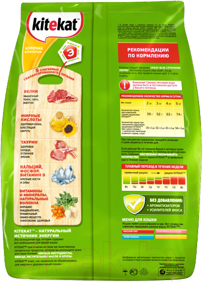 Kitekat для взрослых кошек (Курочка аппетитная) — это полноценная еда, которая содержит все необходимое для вашей кошки. Kitekat приготовлен из таких же качественных продуктов, которые вы используете дома для своих близких: мясные ингредиенты, овощи, растительное масло и крупы.