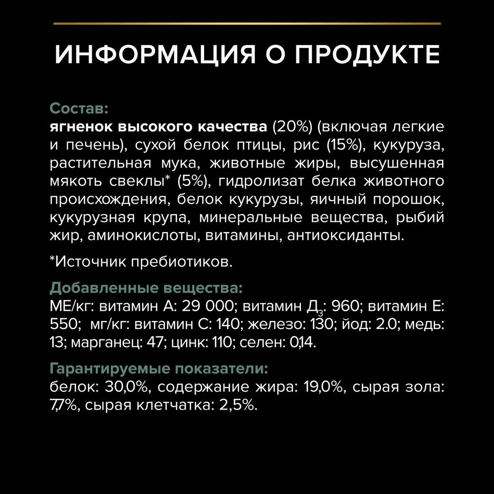 Ингредиенты: ягненок высокого качества (20%) (включая легкие и печень), сухой белок птицы, рис (15%), кукуруза, растительная мука, животные жиры, высушенная мякоть свеклы* (5%), гидролизат белка животного происхождения, белок кукурузы, яичный порошок, кукурузная крупа, минеральные вещества, рыбий жир, аминокислоты, витамины, антиоксиданты.